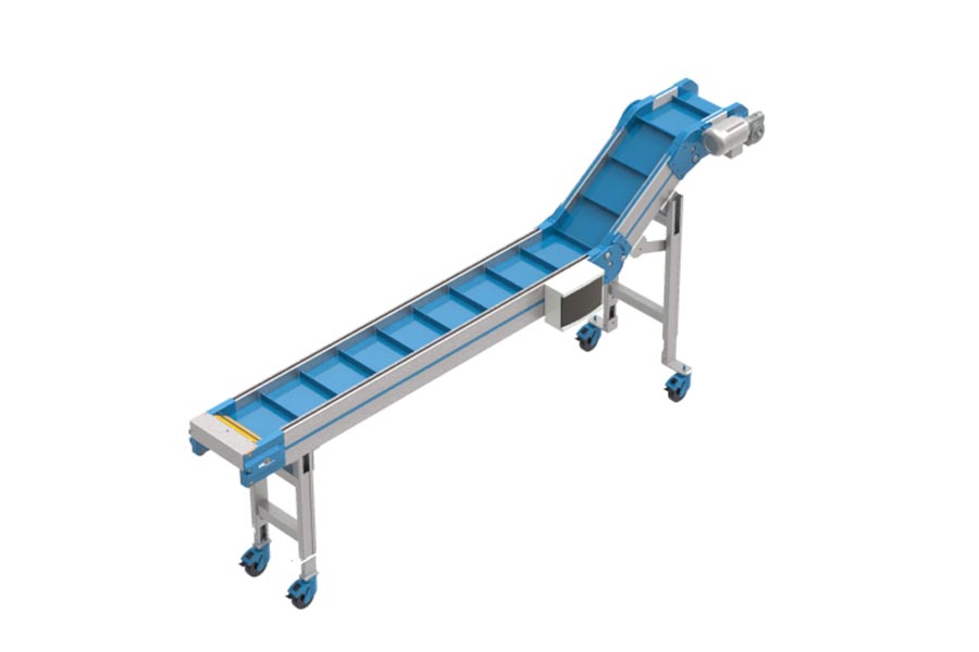 Un tappeto motorizzato multiscomparto (lunghezza 2000 mm) per l’alimentazione pezzi alla macchina confezionatrice, singola pista, facchini con altezza 50 mm, sponde di contenimento standard